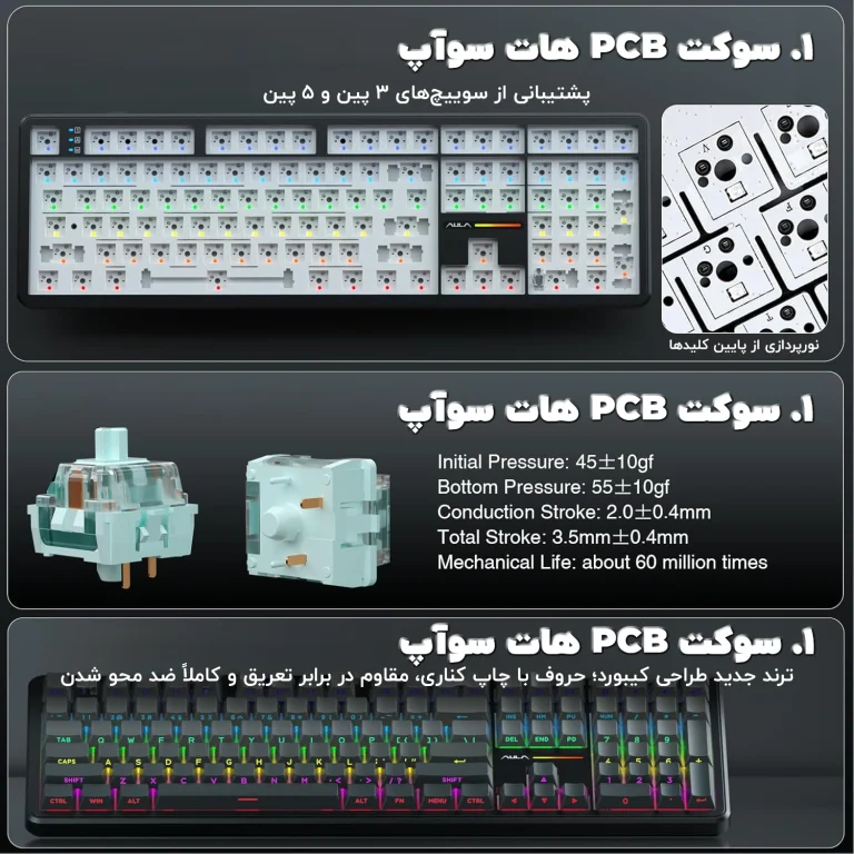 پشتیبانی از سوییچ های هات سوآپ (Hot-Swappable): امکان تعویض سوییچها بدون لحیم، برای سوییچ های ۳ پین و ۵ پین — انعطاف در انتخاب تجربه تایپ یا صدا.