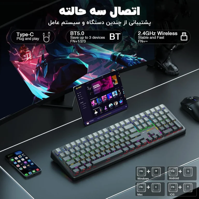 بله، با اتصال سهحالته (بلوتوث، دانگل 2.4GHz و کابل USB) میتوانید به چند دستگاه وصل شوید و به راحتی بین آنها جابهجا شوید. - تفاوت AULA F108 با مدل F75 چیست؟