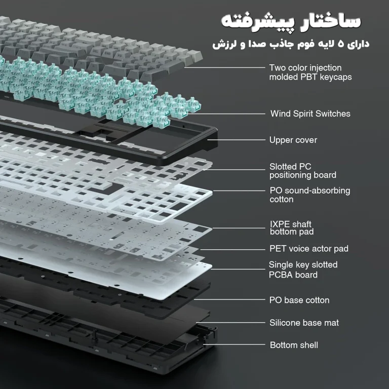 طراحی با ساختار ۵ لایه گستگت جاذب صدا/ضربه: جهت کاهش نویز، افزایش آرامش در هنگام تایپ و به حداقل رساندن صدای توخالی.