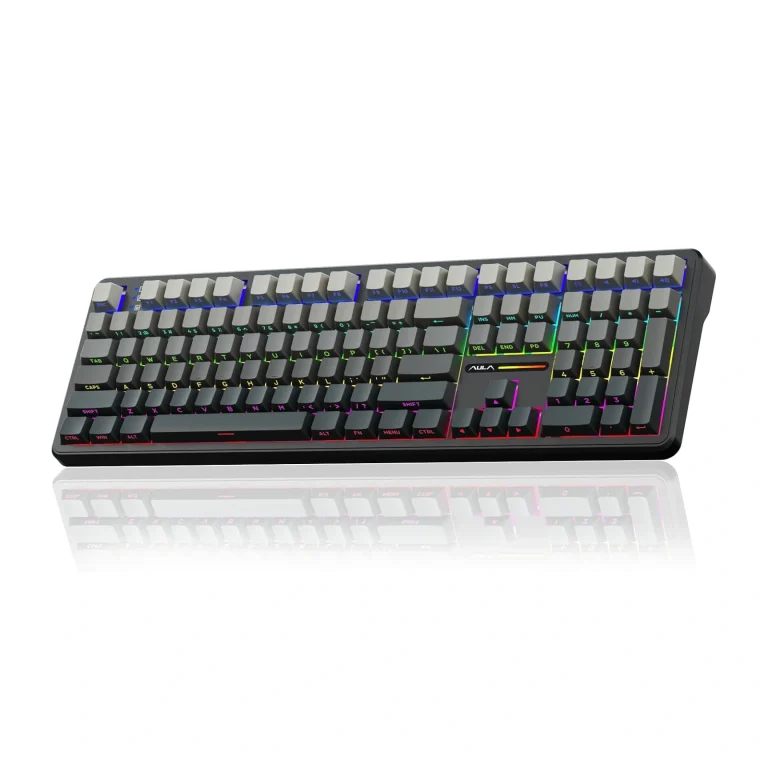 AULA F108 سه حالت اتصال داره: سیمی از طریق USB-C، وایرلس ۲.۴ گیگاهرتزی و بلوتوث. در تستی که داشتم، تأخیر در هر سه حالت پایین بود و حتی در حالت وایرلس هم پاسخگویی سریع و بدون لگ باقی موند. عمر باتری ۴۰۰۰ میلیآمپری هم واقعاً خوبه؛ با نور پسزمینه روشن حدود ۱۰ ساعت دوام میاره و اگه خاموشش کنی به راحتی تا چند روز کار میکنه.